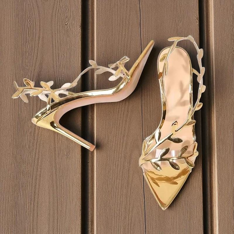Step into elegance with these patent leather gold leaf women s sandals, featuring a glamorous bling finish, pointed toe, and slim high heels. Perfect for weddings, parties, office wear, or nights out, these gladiator-style sandals combine comfort with striking style, ensuring you stand out in any crowd.