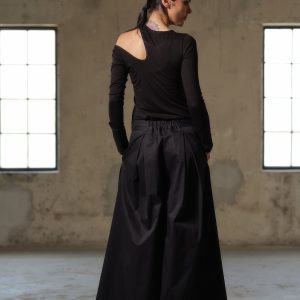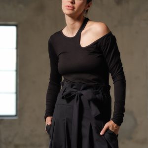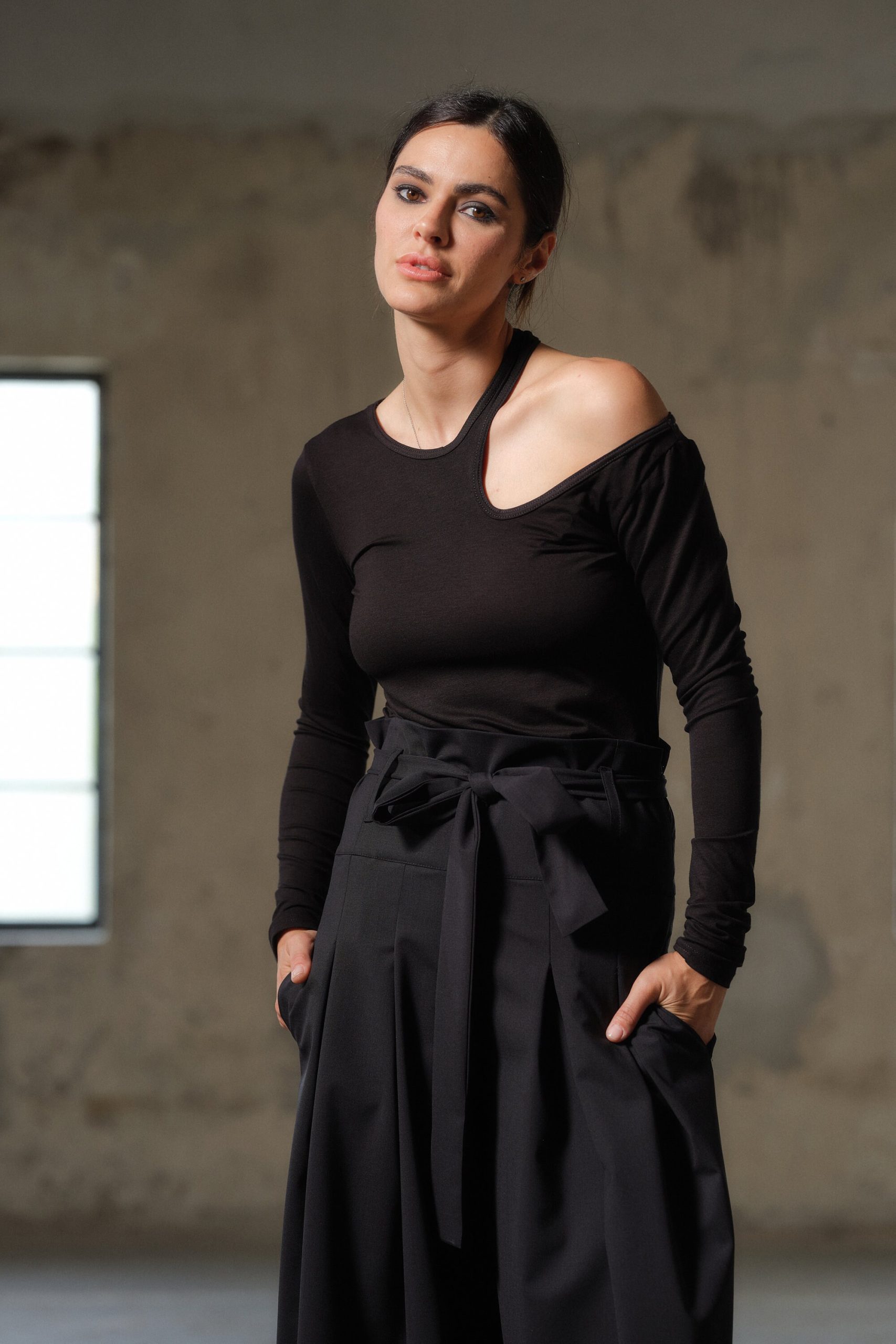 With its long sleeves and an alluring asymmetrical cutout that gracefully reveals one shoulder, this top strikes the perfect balance between elegance and allure. Its sexy, urban, and minimalist vibe adds a touch of contemporary flair to any outfit.