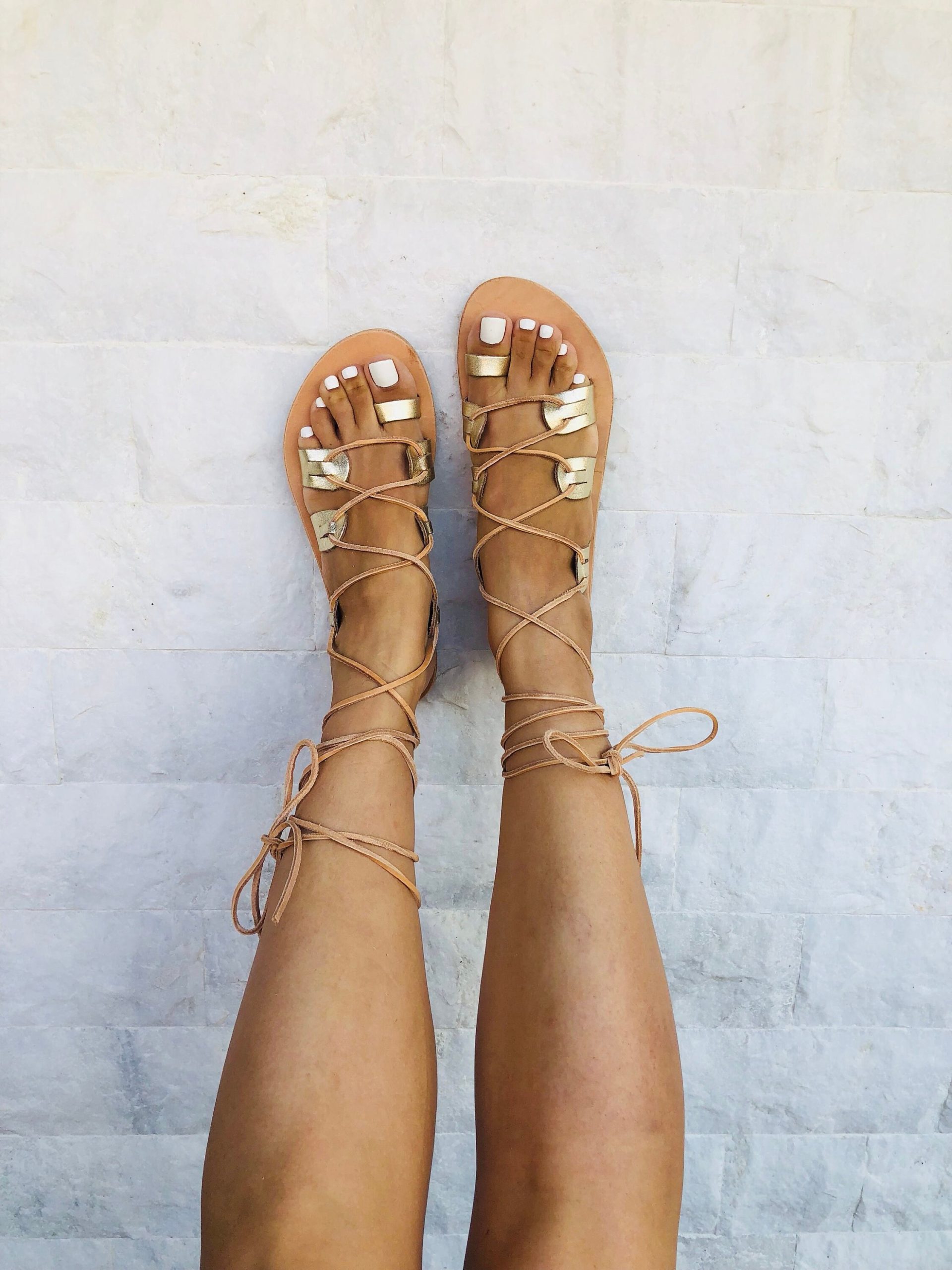 A handmade pair of Lace up gladiator sandals in gold color that you can wrap – tight them until your knees, or lower at your ankles.Find them only at our Store.