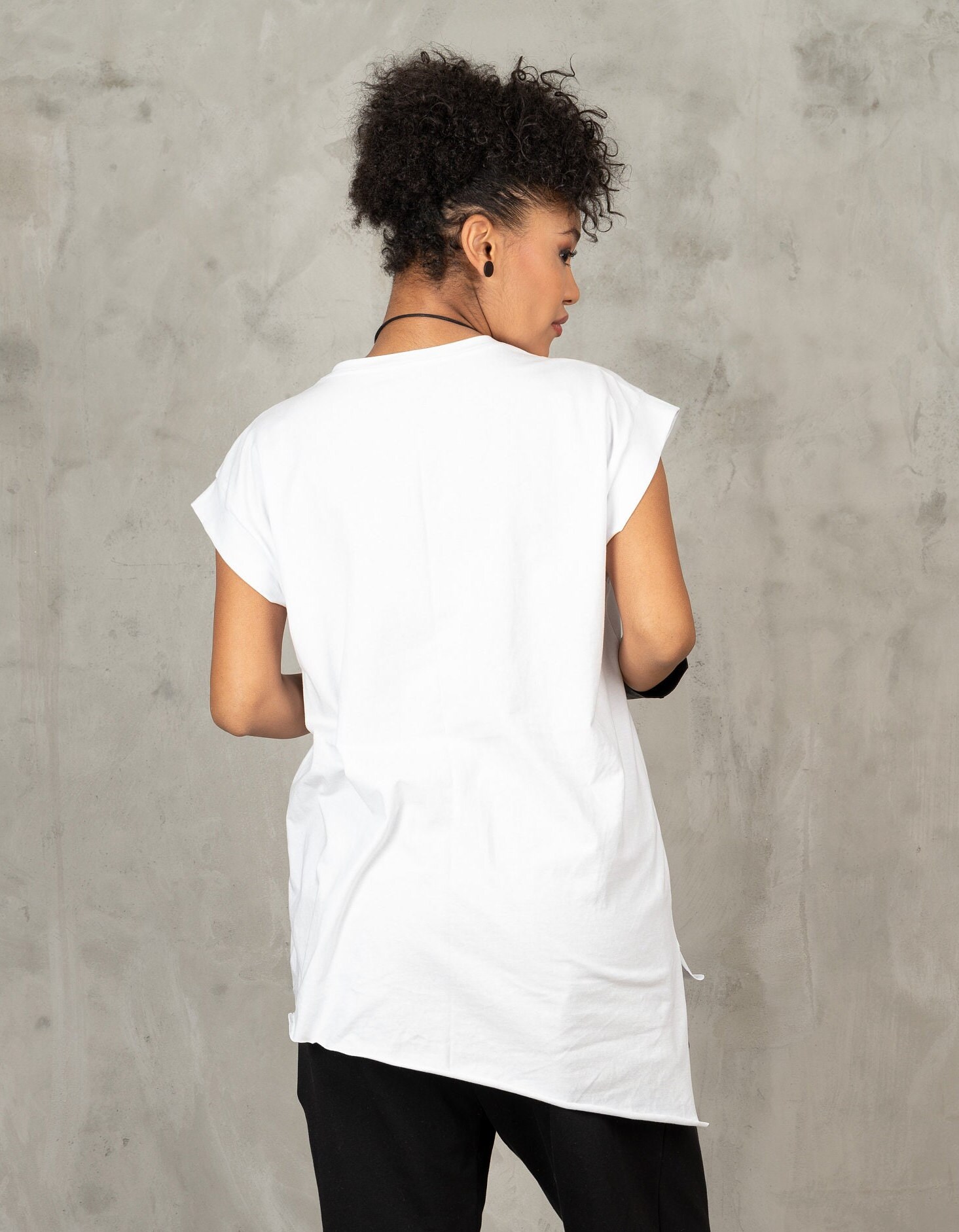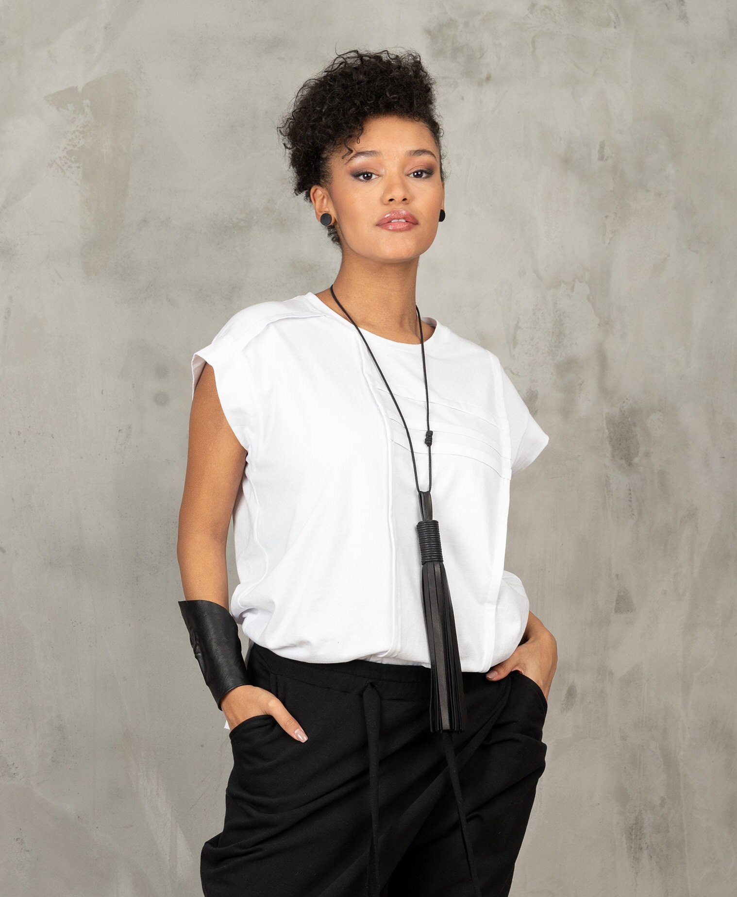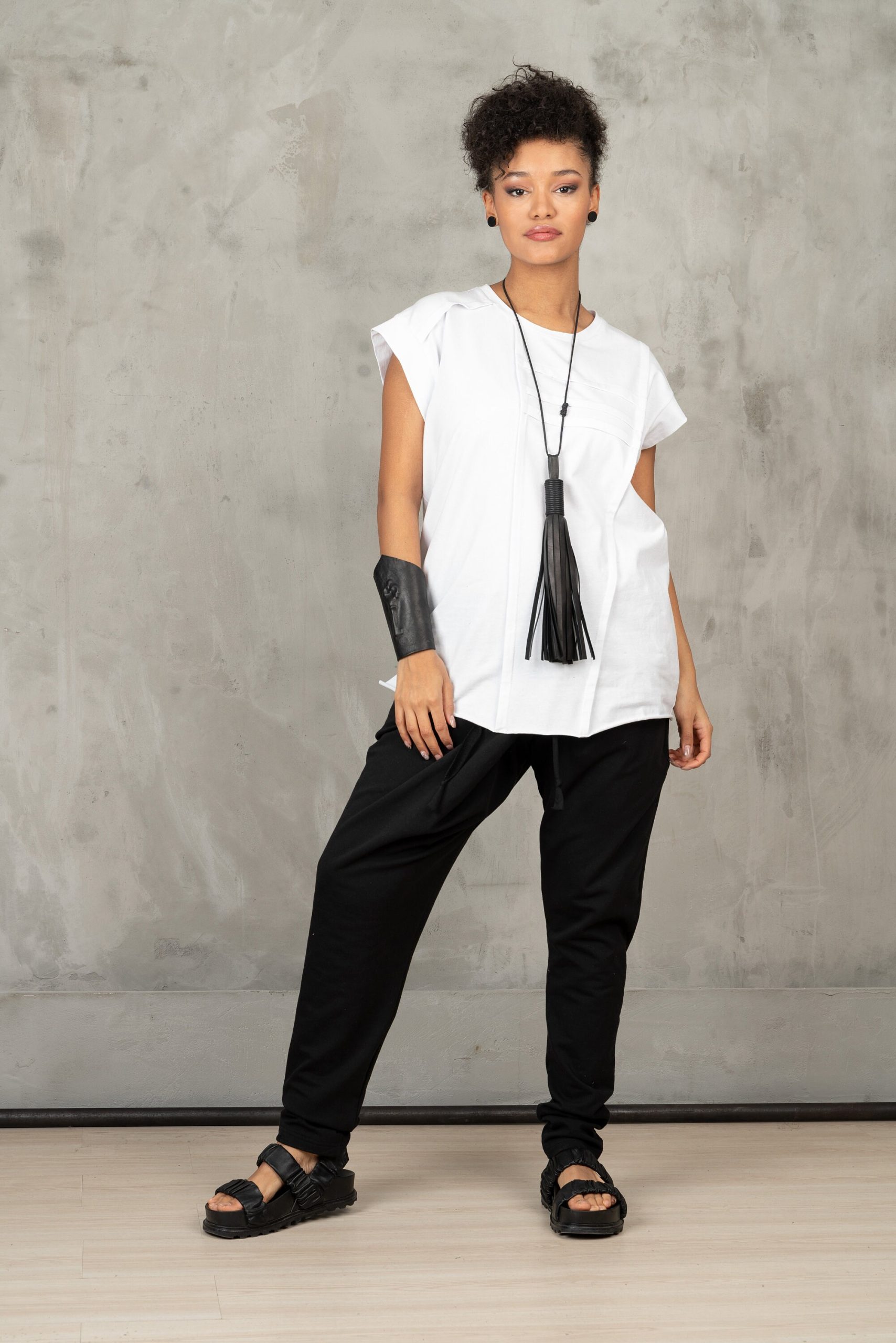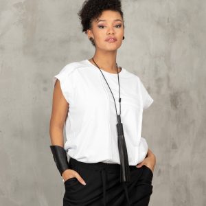The White top avant garde clothing is our favorite weekender. This minimalist clothing featuring a relaxed fit, а аsymmetric shear.